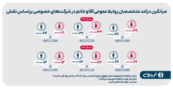 در سال ۱۴۰۳، میانگین درآمد متخصصان و فعالان روابط عمومی در سازمانهای دولتی، شرکتهای خصوصی، شرکت خصوصی/دولتی بهترتیب ۲۷، ۴۱، ۳۶میلیون تومان بوده است. همچنین، میانگین درآمد متخصصان روابط عمومی با ۵ تا ۱۰ سال و بیش از ۱۰ سال سابقه کار به ترتیب ۳۶ و ۴۵میلیون تومان است.