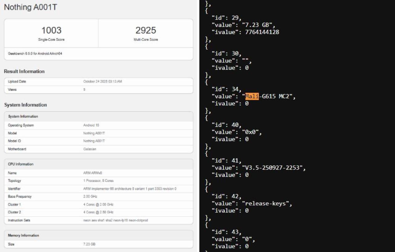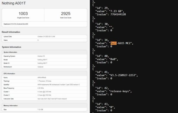 این دستگاه مرموز با شماره مدل Nothing A001T در گیکبنچ ثبت شده است. بر اساس اطلاعات این بنچمارک، قلب تپنده دستگاه، تراشه دایمنسیتی 7300 (Dimensity 7300) ساخت شرکت مدیاتک است که با 8 گیگابایت حافظه رم همراهی میشود.