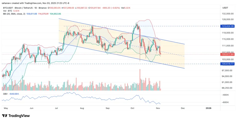 بازگشت قیمت به بالای ۱۰۸,۲۰۰ دلار میتواند نشانهای از احیای قدرت خریداران و آغاز حرکت به سمت مقاومت ۱۱۱ هزار دلار باشد. در مقابل، از دست رفتن حمایت فعلی ممکن است منجر به اصلاح عمیقتر تا محدوده ۱۰۲,۵۰۰ دلار شود. نمودار قیمت بیتکوین نشان میدهد این رمزارز در حال حرکت درون کانال نزولی موازی است که از ماه ژوئیه آغاز شده است. پس از برخورد به خط میانی کانال و رد قیمت در آن سطح، بیتکوین به کف روزانه ۱۰۵,۵۰۰ دلار سقوط کرد و اکنون در حال آزمایش کف کانال است.